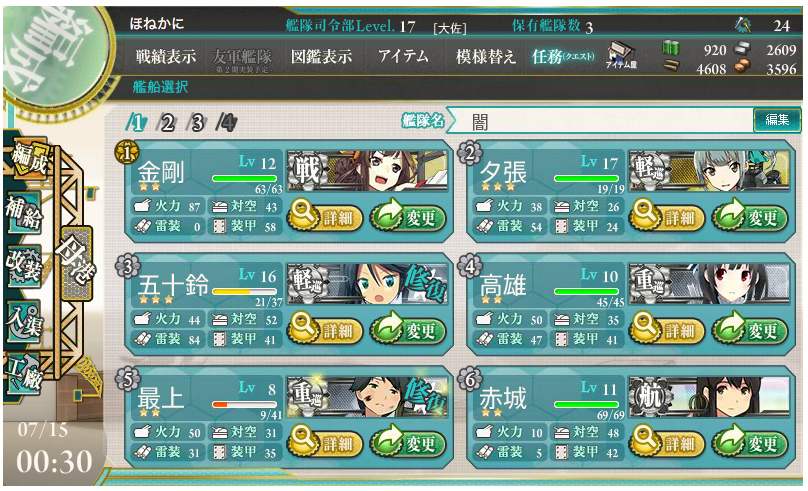 遠征組はひたすら石油と鉄を集め続けています。編成クエスト終わらしたいから天龍とか那智とか出ろ。